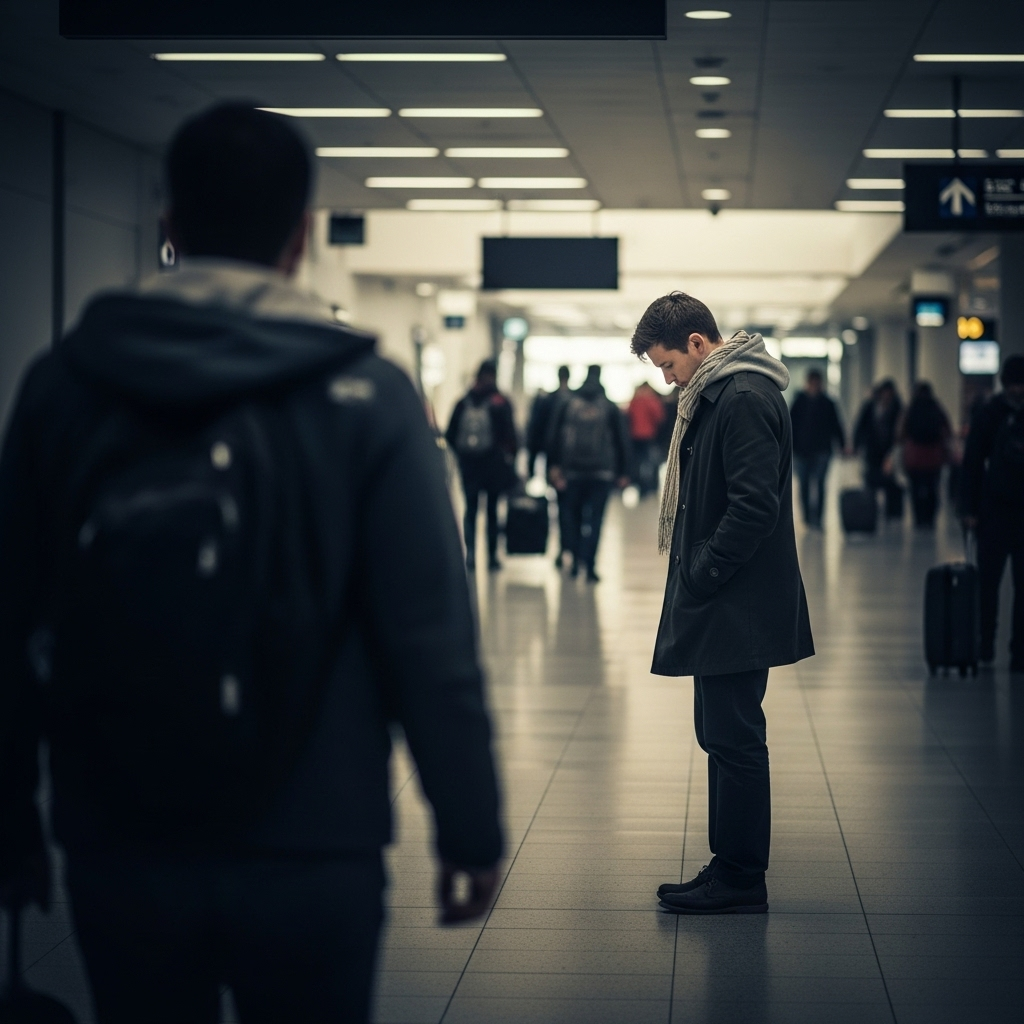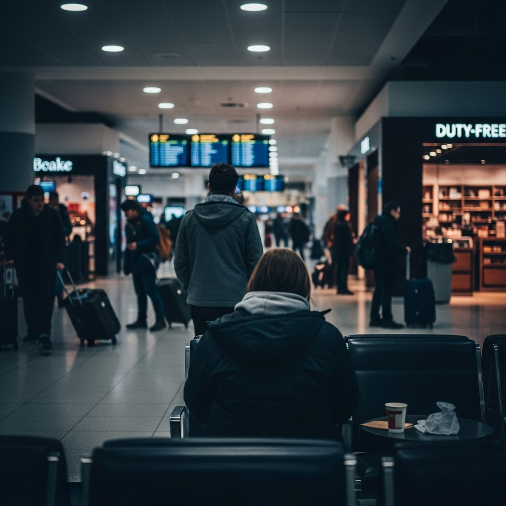 Una persona sola en un aeropuerto, simbolizando la despedida y la **ruptura de un amor a distancia**
